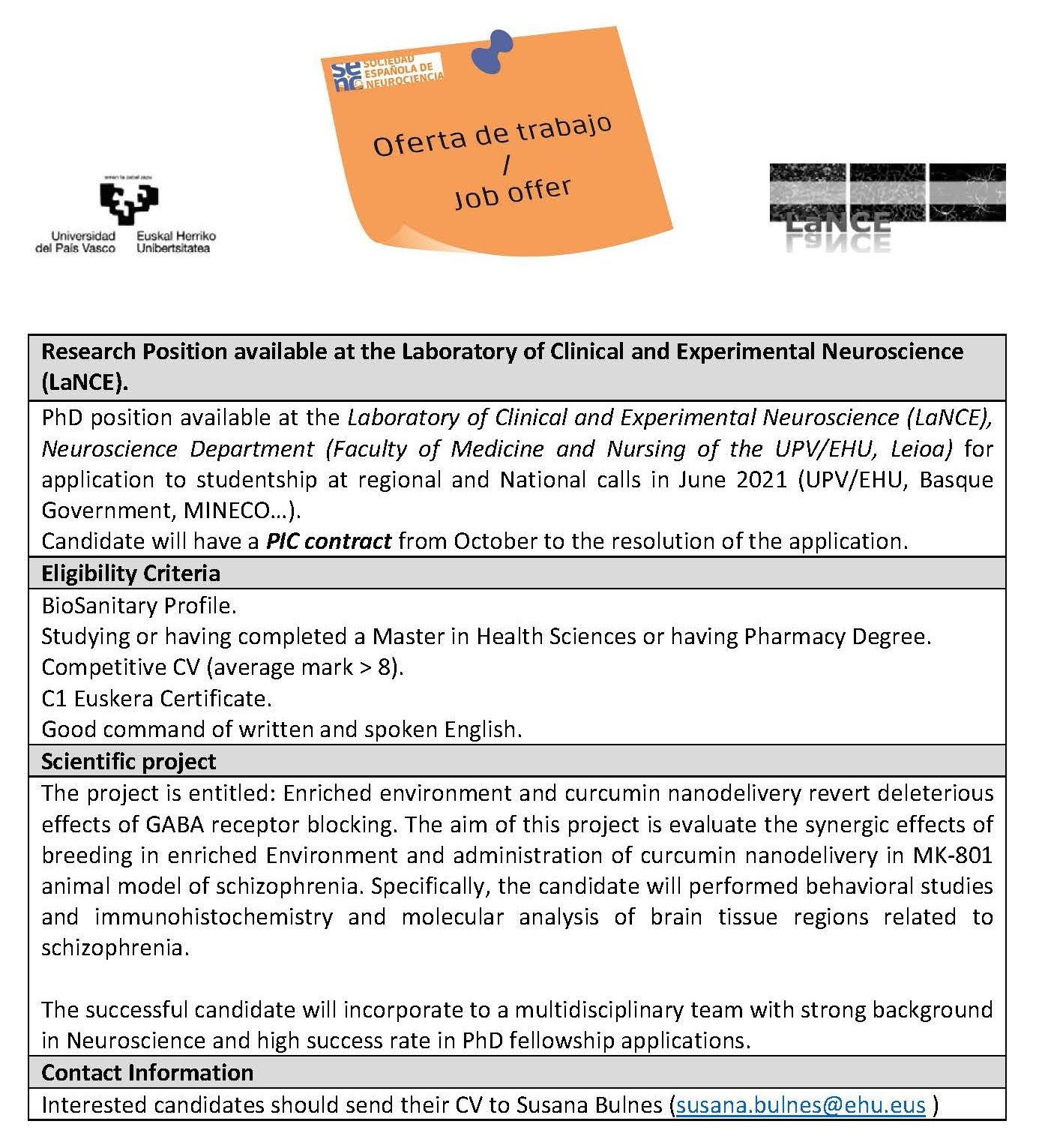 PhD position available in Neuroscience Department (Faculty of Medicine and Nursing of the UPV/EHU) for application to studentship at regional and National calls in June 2021 (UPV/EHU, Basque Government, MINECO…). Candidate will have a PIC contract from October to the resolution of the application.