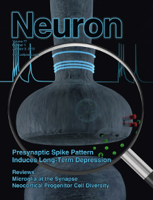 Activity-dependent plasticity is important for synaptic refinement during cortical development. The cover shows that a specific spike pattern in individual presynaptic layer 4 neurons (blue traces) can induce long-term depression (LTD) without the involvement of the postsynaptic neuron. This presynaptic spike pattern-dependent LTD (p-LTD) requires release of glutamate (green spheres) activating presynaptic NMDA receptors (red rods).