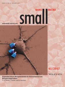 In this article by Carlos A. Saura, Jaume Esteve, and co-workers, show fabrication of suspended silicon microphotodiodes as a simple and cost-effective wire-less microtool for delivering photocurrent in liquid media. Electrical and electrochemical characterization of microphotodiodes under on/off illumination conditions was performed. Their effectiveness as remote photovoltaic cells for life science applications was evaluated in vitro in mouse cultured neurons. The picture shows silicon microphotodiodes bound to the cell surface of a neuron captured by scanning electron microscopy.