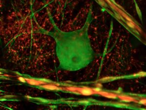 El ojo del mamífero mas grande del planeta pesaba 1kilo y fue procesado pocas horas después de morir en la playa. La fotografía de fluorescencia muestra la neurona marcada con un anticuerpo contra dos tipos de neurofilamentos HP (verde) y H (rojo). Los neurofilamentos son proteínas fibrosas que tienen una función estructural, formando el citoesqueleto celular. La neurona de la fotografía es una de las encargadas de transmitir el mensaje desde el ojo hasta el cerebro, por lo que, en la ballena, los axones de estas neuronas recorren varios metros a través del nervio óptico antes de llegar a su relevo en el cerebro. En la ballena, varias de estas neuronas miden hasta 100 micrómetros de diámetro celular, mas del doble que en humanos, por lo que se han denominado neuronas gigantes. Algunos axones con forma arrosariada, que aparecen en primer plano de color amarillo, indican que tienen los dos tipos de neurofilamentos, y tienen un diámetro de varios micrómetros, muy superior a lo normal, indicando las largas distancias que tienen que recorrer